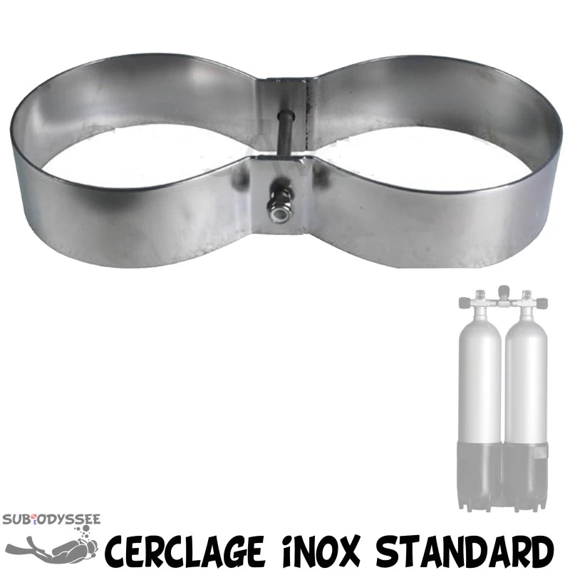 Cerclage Inox de largeur standard pour Bi-bouteilles. Largeur : 30 mm Acier Inox 316 marine (y compris la visserie).
